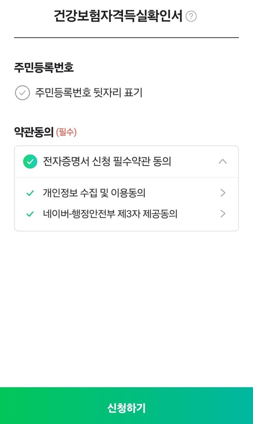 1. 건강보험자격득실확인서 클릭: 네이버 모바일 전자증명서 화면에서 '건강보험자격득실확인서'를 클릭합니다. 이때 주민등록번호 뒷자리 표기 여부를 선택합니다.