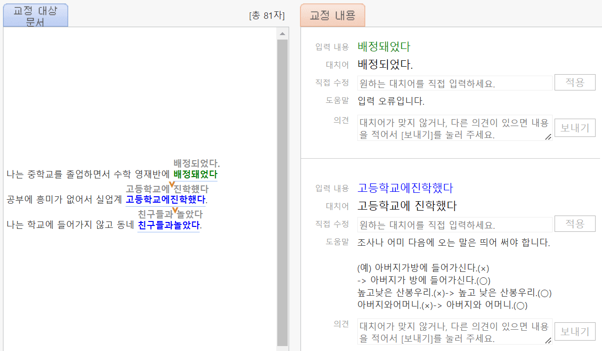 네이버와 부산대는 데이터를 공유하고 있지만 잡코리아의 경우 부산대 데이터 기반으로 하고 있어도 조사 체크 기능은 미흡하기 때문에 문벚적으로 정확한 문장을 작성하려면 부산대 맞춤법 검사기가 현재로써 가장 신뢰할 만한 데이터라고 보실 수 있습니다.